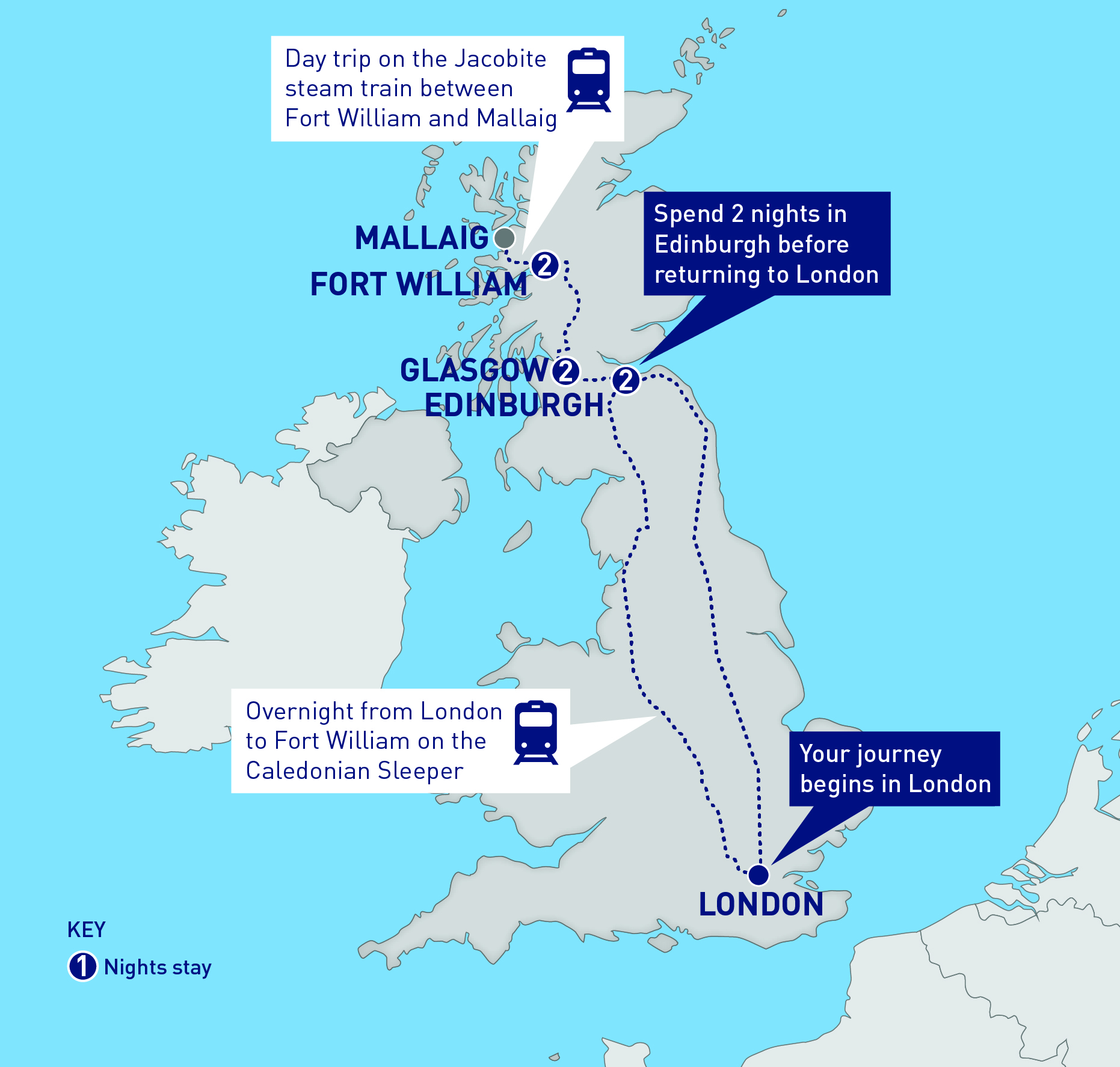 The Caledonian Sleeper from London to Scotland. An experience which harks back to a bygone era of rail travel we are treated to a magical journey whilst travelling through undulating English countryside from the relaxed comfort of our classic and club cabins. Theres something immensely satisfying about rail holidays in Scotland.