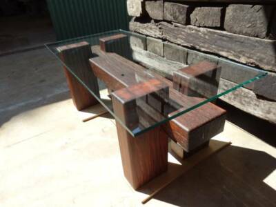 Glass Topped Railway Sleeper Coffee Table. We source hardwood sleepers from our sawmill at Braidwood. Recycled Timber is readily available at our Fremantle Warehouse in all shapes sizes and forms - from Hardwood Slabs Posts Beams Bush Poles Gluts Wharf Timber Railway Sleepers Stair Treads Recycled Timber Timber Supplies Perth Recycled Flooring to Re-milled Decking and more.